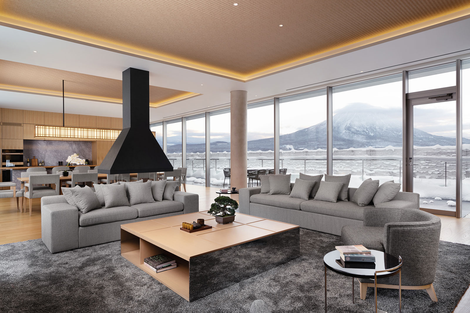 室内设计充分考虑与融合了日本传统的至纯精神和当代的奢华,为Setsu Niseko营造了一个舒适、优雅、温暖的空间。别具匠心的障子设计,带给住户非同寻常的惊喜和愉悦。带有壁橱和日本蒲团的榻榻米多功能房间为家庭了提供了不少便利。 为了优化观景体验,尽情欣赏二世谷的壮丽景色,每套公寓都拥有全景景观以及整合式窗台与沙发床坐垫,感受着无敌的视觉盛宴。这一灵感来自于日式传统房屋中可以连接室内外空间的缘侧。